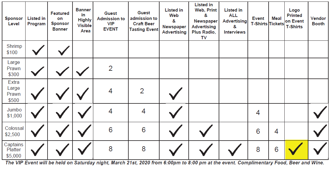 CAPTAIN’S PLATTER $5,000 – Same as the Colossal Sponsor plus sponsor name or logo printed on the 2020 ShrimpFest t-shirts, your name in all advertising and interviews, 6 complementary meal tickets, 8 guests to the Craft Brew Tasting event and 8 complimentary 2020 ShrimpFest t-shirts. Captain’s Platter payment must be received at least 1 month prior to the event to include printed name on shirts.